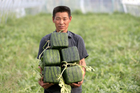 近日,江苏省淮安市盱眙县农户种植的方形西瓜进入成熟期并大量上市。这种方形西瓜采用有机方式种植,具有易运输、皮薄汁多等特点,售价是普通西瓜的10倍。