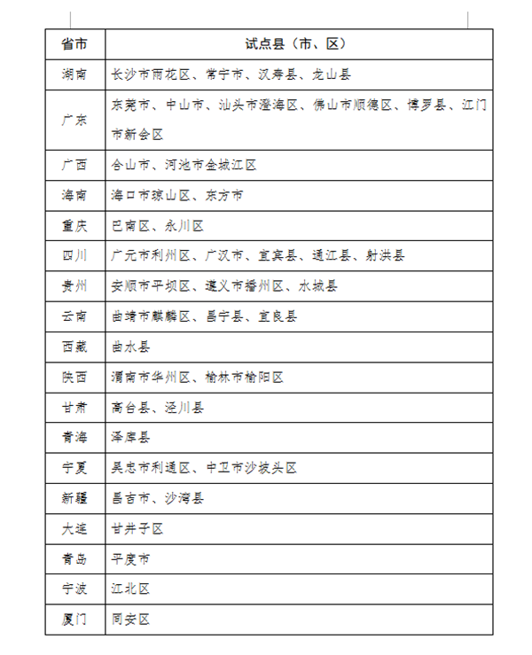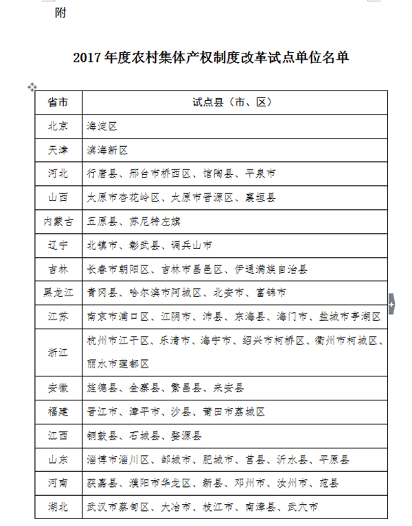 为贯彻落实《中共中央国务院关于稳步推进农村集体产权制度改革的意见》精神,由点及面开展集体经营性资产产权制度改革,经各省、自治区、直辖市及计划单列市推荐,农业部、中央农办确定北京市海淀区等100个县(市、区)为2017年度农村集体产权制度改革试点单位。西藏自治区曲水县、新疆维吾尔自治区沙湾县作为2015年确定的农村集体资产股份权能改革试点县,在完成好原有试点任务的基础上,承担新一轮改革试点任务。所有试点单位的试点时间到2018年底结束。