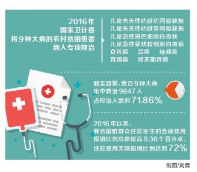 为了减轻贫困人口的大病看病负担,2016年,国家卫计委将9种大病的农村贫困患者纳入专项救治,并在河南、贵州等8省(区)先行启动。这9种疾病分别是儿童先天性心脏房间隔缺损、儿童先天性心脏室间隔缺损、儿童急性淋巴细胞白血病、儿童急性早幼粒细胞白血病、食管癌、胃癌、结肠癌、直肠癌、终末期肾病。截至目前,我省9种大病集中救治9847人,占应治人数的71.86%。