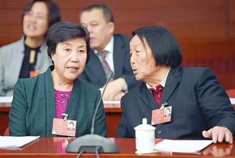 申纪兰(右)与郭凤莲(左)在人大会现场,郭凤莲在向申纪兰转述会议内容。15年的两会会场上,郭凤莲常常坐在申纪兰右手边,她开玩笑说:“她是申大姐,我是郭二姐。”