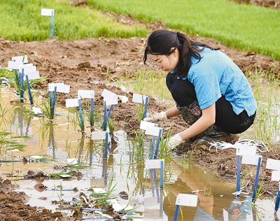 图为5月20日,技术人员在青岛海水稻研发中心筛选即将转入盐度试验田内种植的秧苗。