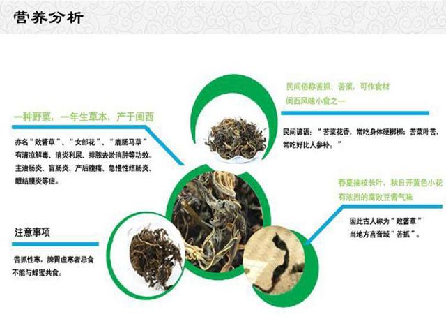 苦叶菜又名败酱,俗称胭脂麻苦叶菜。为败酱科多年草本,分白花败酱和黄花败酱两种,味道微苦,有陈酱气,适合旺火蒸、炖、炒。