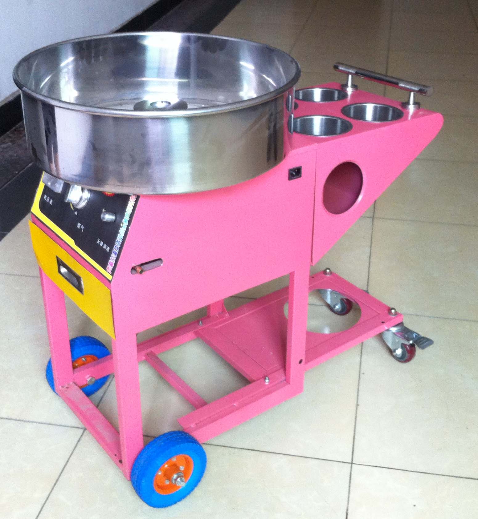 最新款小推车棉花糖机,彩色电动棉花糖机新品上市!该款机器款式新颖,设计合理大方,新增放置煤气罐底座,流动作业更方便,电瓶和煤气罐都可以搁置在机器上流动生产,再也不必烦恼做棉花糖东奔西走,煤气罐和电瓶不方便携带的问题啦。操作台面干净整洁大方,设有四个不锈钢储糖盒和放置竹签的竹签盒,下面有充气轮和刹车轮,能推能拉。侧边打开抽屉可以放置零钱,贴心的设计更适合流动做棉花糖生意的朋友们。