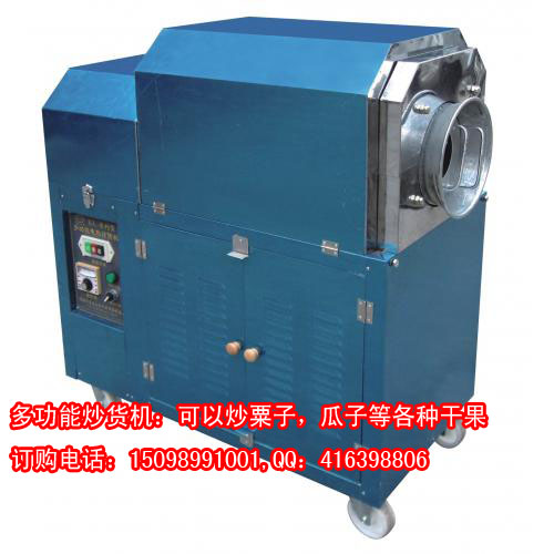 多功能炒货机集各种大中小型炒货机的优点为一体,可使用液化气或燃煤作为加热源,自动旋转、自动翻炒、自动出锅,整机采用进口不锈钢板加工成形,外观豪华气派,美观大方,清洁卫生,机器采用了先进的滚筒卧式结构,滚筒加热均匀,并有保温功能 , 工作时滚筒不停地旋转,使炒货食品上下、左右、前后、全方位立体翻炒,不会出现粘锅现象,炒制出的食品色泽金红亮丽,香气扑鼻。炒货出入锅十分方便,只需按动正反转开关,电机既带动滚筒反转,炒货和小石子会一同出锅,自动分离,迅速快捷,省事不费力,干净又卫生。是一种值得广大中小投资者关注的好设备,适合于炒货厂、商场、菜市场、超市居民区农村集市等固定经营,也可流动现炒,理想的炒货设备。.